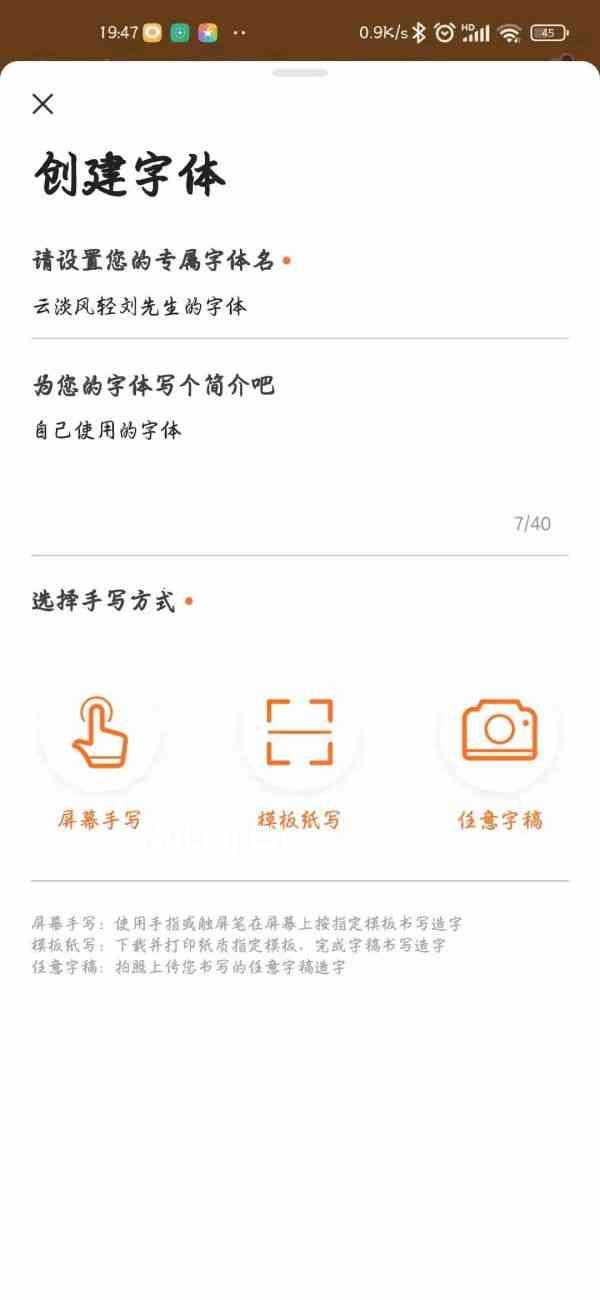 选择手写方式说明:屏幕书写就是直接在屏幕上写字,因为是用手指写的,实际上跟笔写出来还是有很大不同的,除非你有手机屏幕能用的标准笔才建议使用这个,否则建议使用模板纸写,模板需要下载打印的,必须要有打印机;第三个任意字稿也是不建议使用的,要用纯白的纸,不界框,分散的写100+的字,然后拍照进行识别,实际我测试的效果不是很好,不过如果没有打印机的前提下,使用这个也是可以的,就是非常麻烦,提示好像是有3次免费识别机会的。